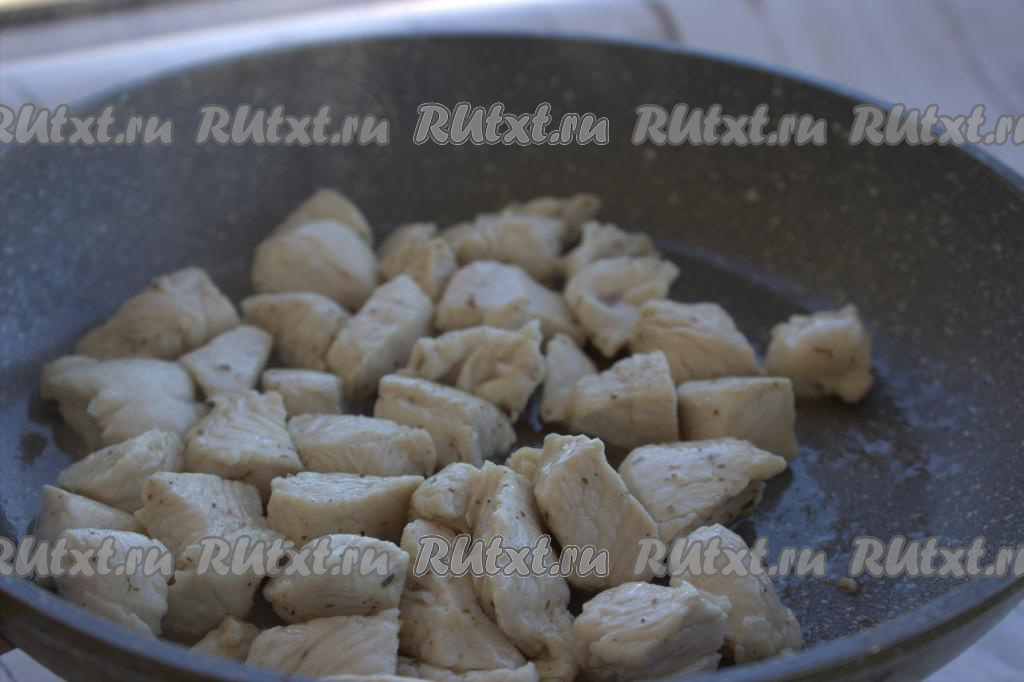В глубокую сковороду (можно готовить и в казане) влить растительное масло, разогреть его и выложить кусочки куриного филе, обжарить мясо на достаточно сильном огне, иногда помешивая, до подрумянивания со всех сторон (на это потребуется минуты 2-3), немного поперчить.