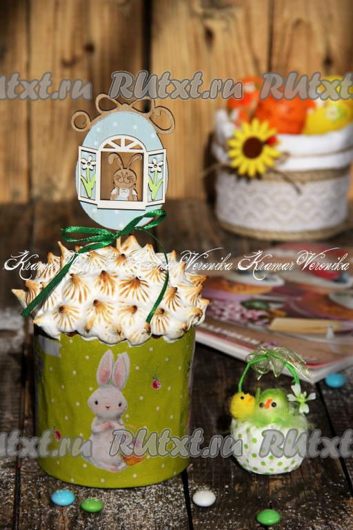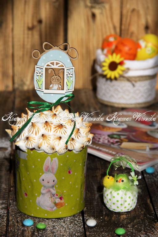Украсить куличи любой глазурью, я приготовила белковую глазурь. Взбила 1 хорошо охлаждённый белок миксером, затем, постепенно добавляя сахарную пудру (всего ушло 100 грамм), взбила миксером глазурь до стойких пиков. Готовую глазурь отсадила через фигурную насадку на куличи и обожгла горелкой. Получилось очень красиво!