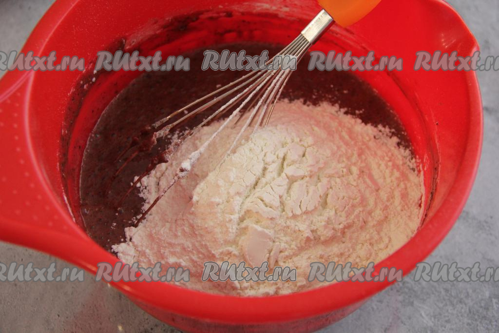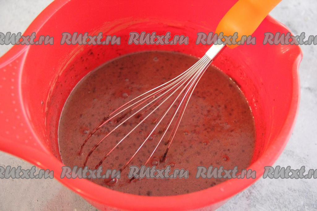 Перемешать массу венчиком. Всыпать какао, ванилин, соль и влить красный краситель, хорошо перемешать.