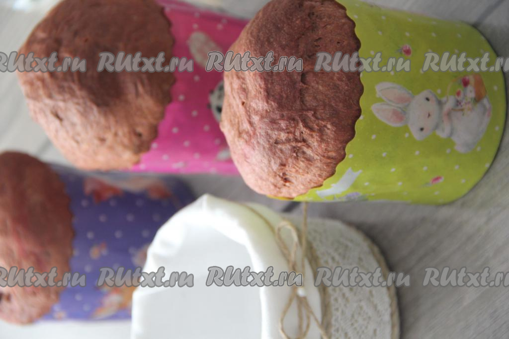 Поставить формы с куличами "Красный бархат" в разогретую духовку и выпекать минут 35 при температуре 180 градусов (готовность куличей проверьте, проколов их сухой шпажкой, если кулич готов, значит шпажка останется сухой).