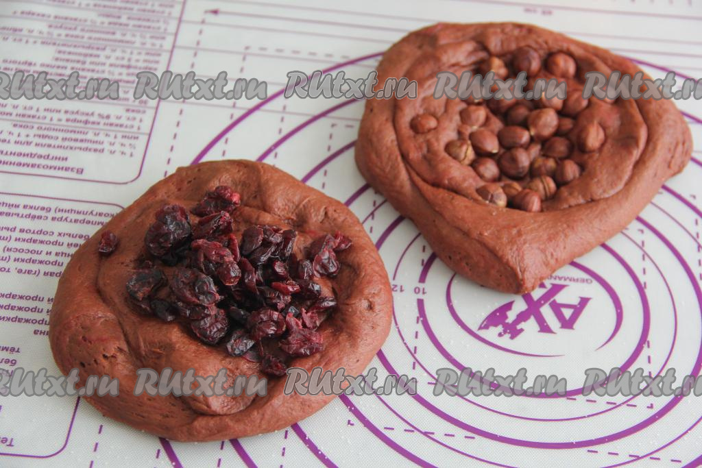 Затем обмять тесто и разделить на три части. В каждую часть добавить сухофрукты (изюм, курагу, чернослив и т.д.). В 2 части теста я добавила вяленую вишню, вмесить вишню в тесто. В одну часть теста я добавила орехи и вмесила их.