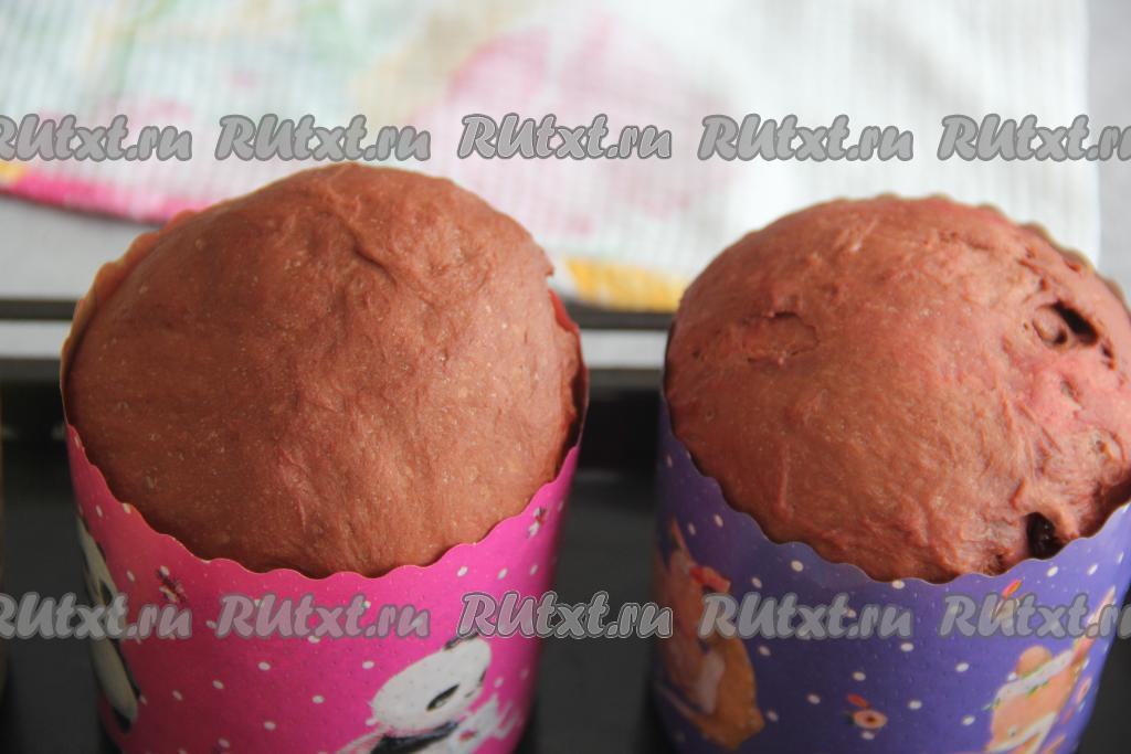 Выложить тесто в формы, заполняя их до середины, и оставить на 35 минут для расстойки. Я использовала бумажные формочки для куличей, их смазывать не надо. Если у вас железные формы, то обязательно сперва смажьте их маслом изнутри.