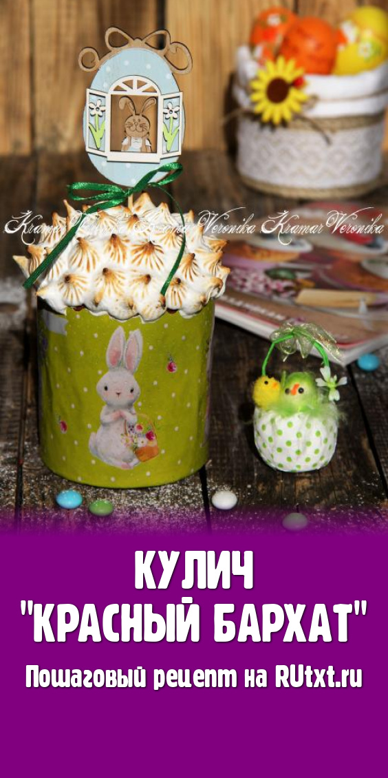 На праздник Пасхи можно приготовить красивый и очень вкусный кулич "Красный бархат". Кулич получается с пористой и влажной текстурой, очень ароматным, с ярким разрезом. Я готовлю куличи по разным рецептам. Но это, наверное, один из самых вкусных куличей, приготовленных мною. Тесто замешиваем руками, формы можно взять любые, я использовала бумажные для куличей. Из этого количества теста выходит 3 средних кулича.