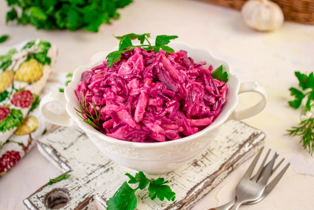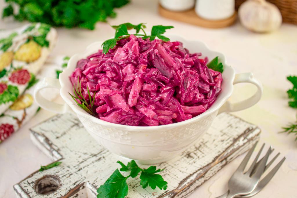 Этот салат получил название "Розовый фламинго", благодаря яркому цвету, который придаёт ему свекла. Есть несколько вариантов этого блюда - с крабовыми палочками, с кальмарами или с сочетанием кальмаров и крабовых палочек. Предлагаю приготовить вкусный, сочный салат "Розовый фламинго" с кальмарами. Для заправки я использовала сметану, которую можно заменить на майонез. Этот несложный салат можно подать к обеду или ужину в выходной день, отлично подойдёт он и для праздничного стола.