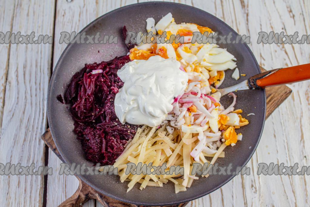 Перемешайте салат "Розовый фламинго". До подачи храните салат в холодильнике, затянув салатник плёнкой.