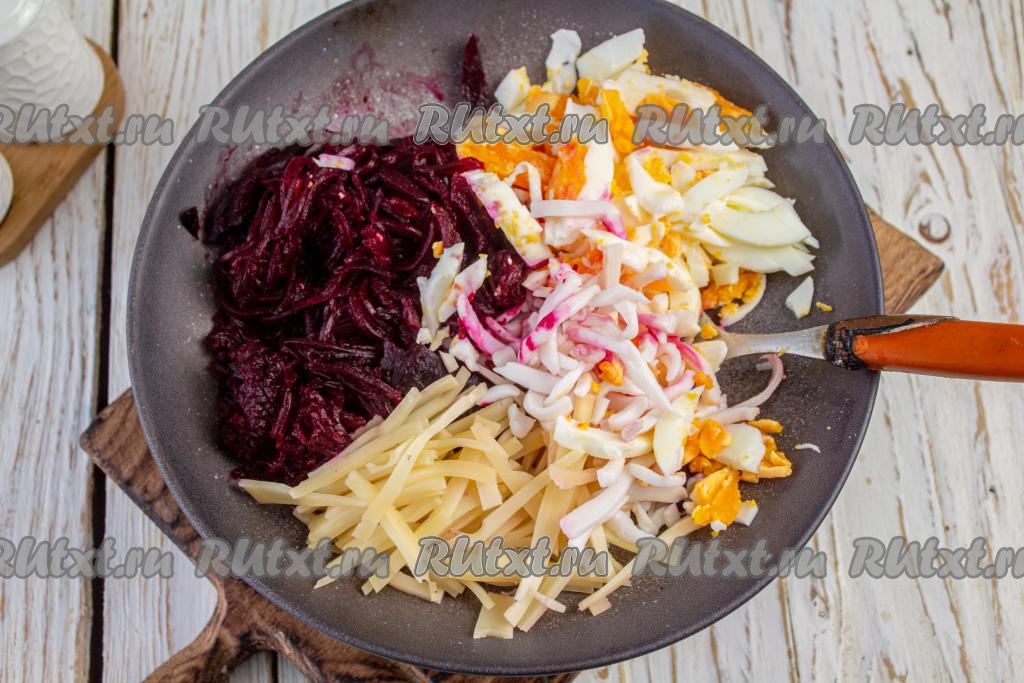 Выложите в салатник кальмара, нарезанного соломкой. Остывшую запечённую свеклу очистите и натрите на тёрке для моркови по-корейски (или нарежьте её тонкой соломкой), тоже выложите в салатник.