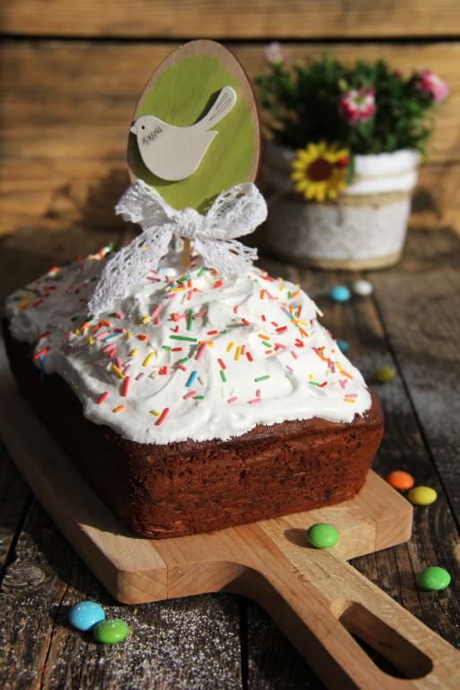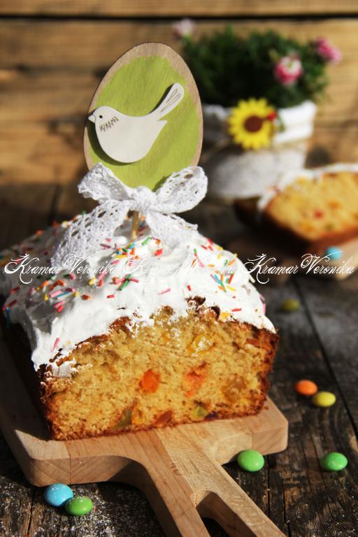 Вкусный, ароматный, влажный кекс остудить, а затем покрыть глазурью. Я использовала готовую покупную глазурь в пакетиках. Украсить пасхальный кекс с цукатами цветной посыпкой. Посмотрите, очень симпатичный кекс получился. Он украсит стол в Светлый праздник Пасхи!