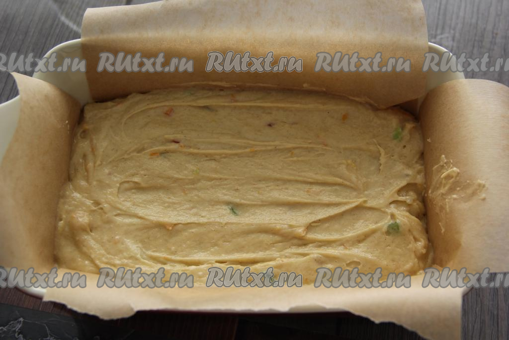 Форму застелить пергаментом. Выложить тесто в форму (я выпекала в обычной форме для прямоугольного кекса) и разровнять.