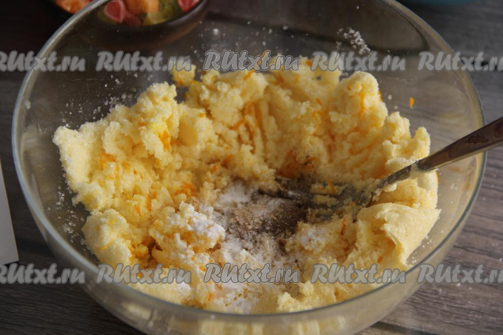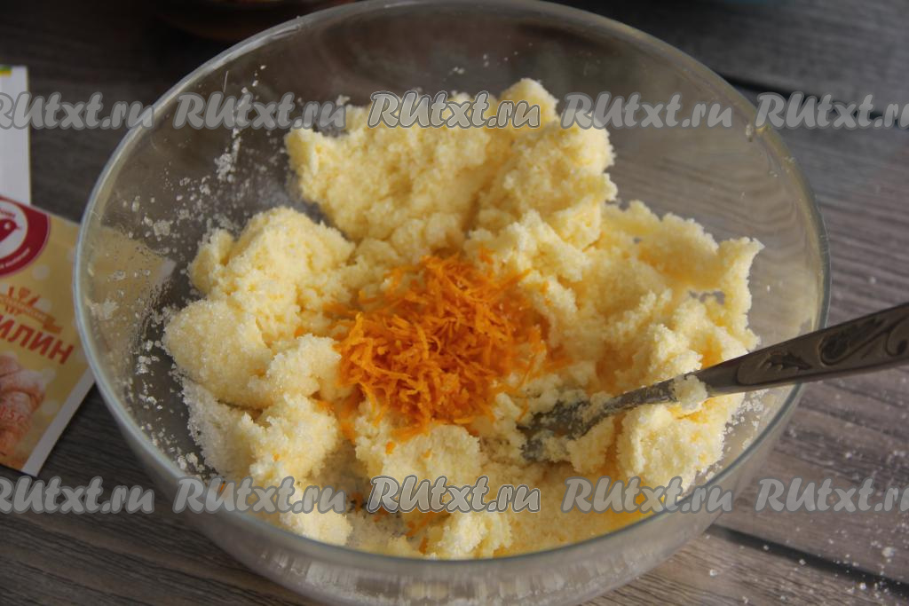 С помощью вилки (или венчика) перетереть масло с сахаром до однородности, добавить цедру апельсина.