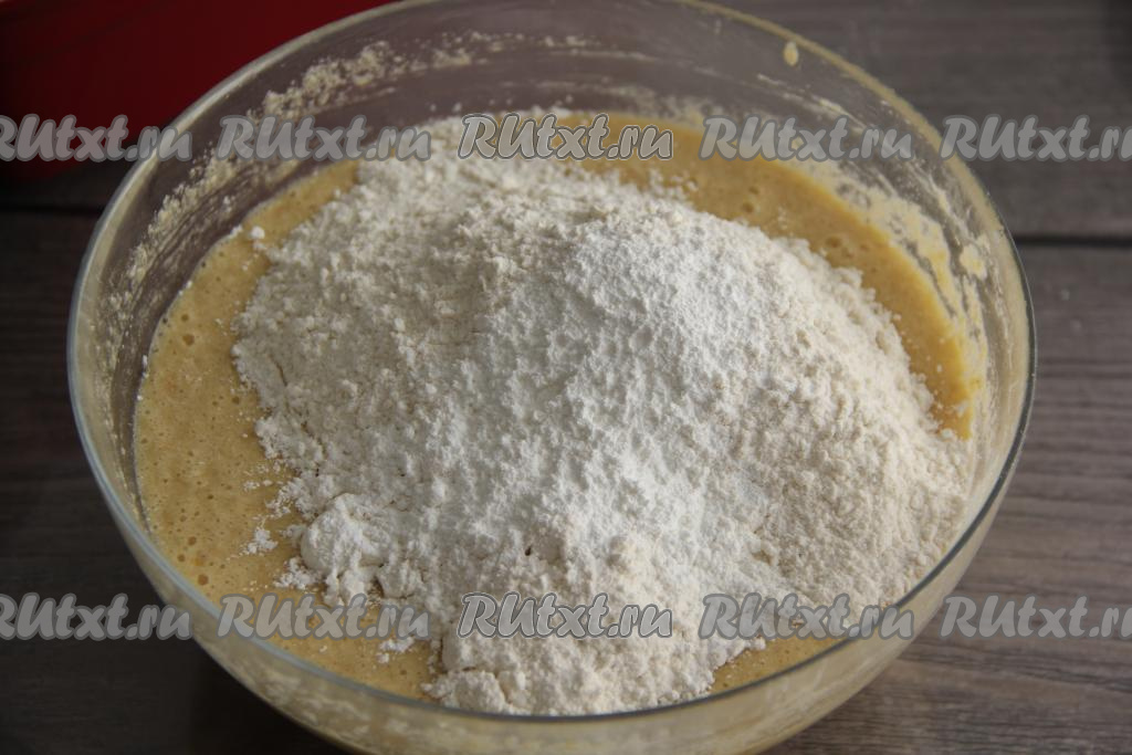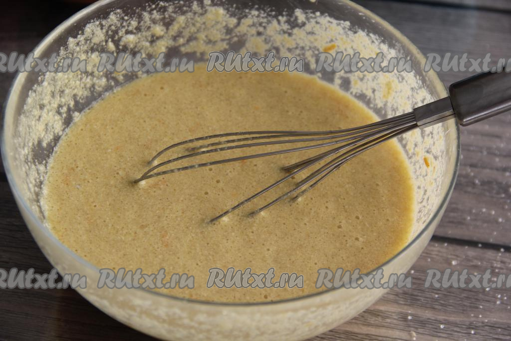 Перемешать тесто ложкой или лопаткой. Тесто получится в меру густым, воздушным и комковатым.