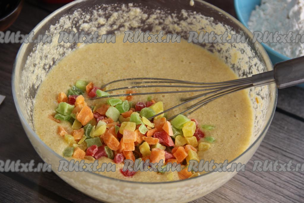 Скоро Светлый праздник Пасхи и я предлагаю испечь пасхальный кекс с цукатами. Рецепт достаточно прост, тесто замешивается с помощью обычного венчика, без добавления дрожжей. Кекс получается очень вкусным и ароматным, с влажной текстурой и мелкопористым мякишем. Украсить верх кекса можно белковой или сахарной глазурью (я взяла покупную глазурь) и посыпать цветной посыпкой.