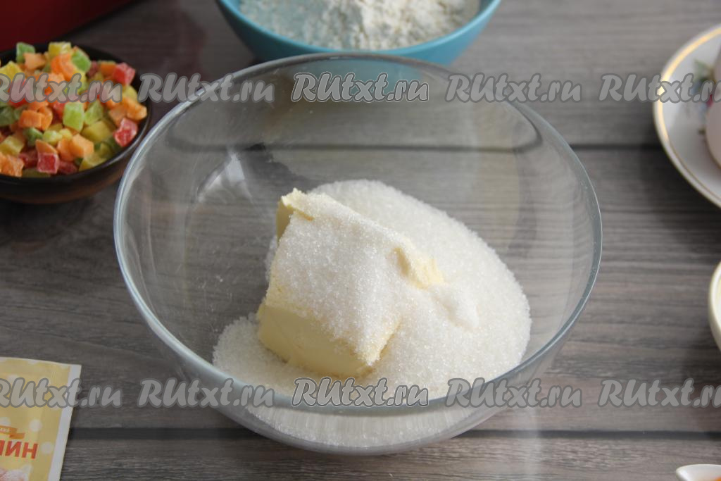 Соединить в глубокой миске мягкое сливочное масло и сахар.