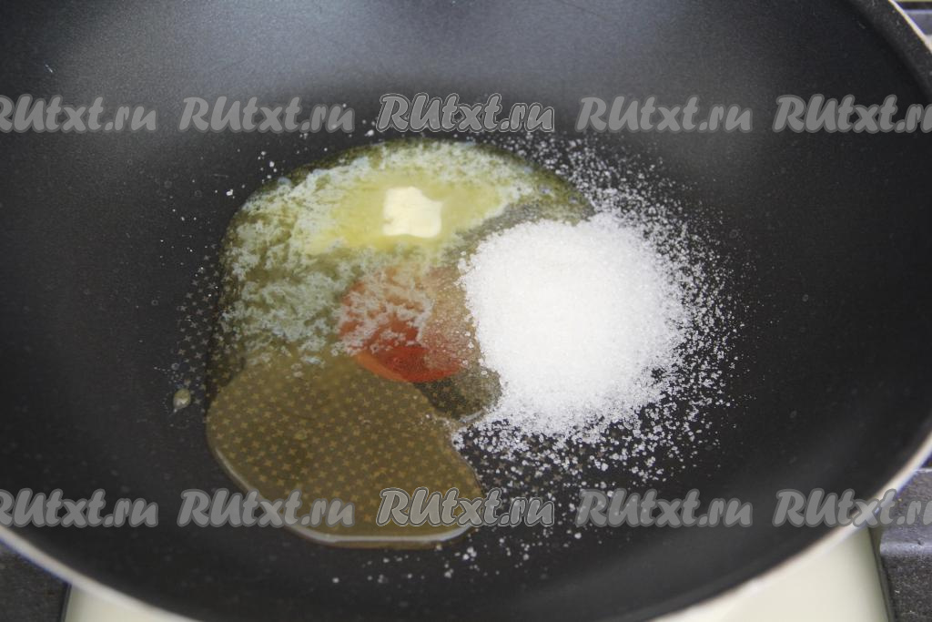 Для начала приготовим начинку из яблок. Яблоки вымыть и удалить плодоножку с косточками. Я не очищала яблоки от кожуры. В сковороду выложить сахар, масло и мёд, растопить, помешивая, на среднем огне до жидкого состояния.