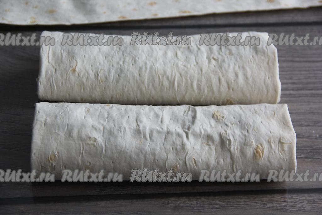 Завернуть начинку в лаваш, подворачивая вначале края лаваша на начинку с узких сторон, а затем свернуть в рулет, начиная с широкой стороны, формируя плоский штрудель. Аналогично сформировать второй штрудель из лаваша.