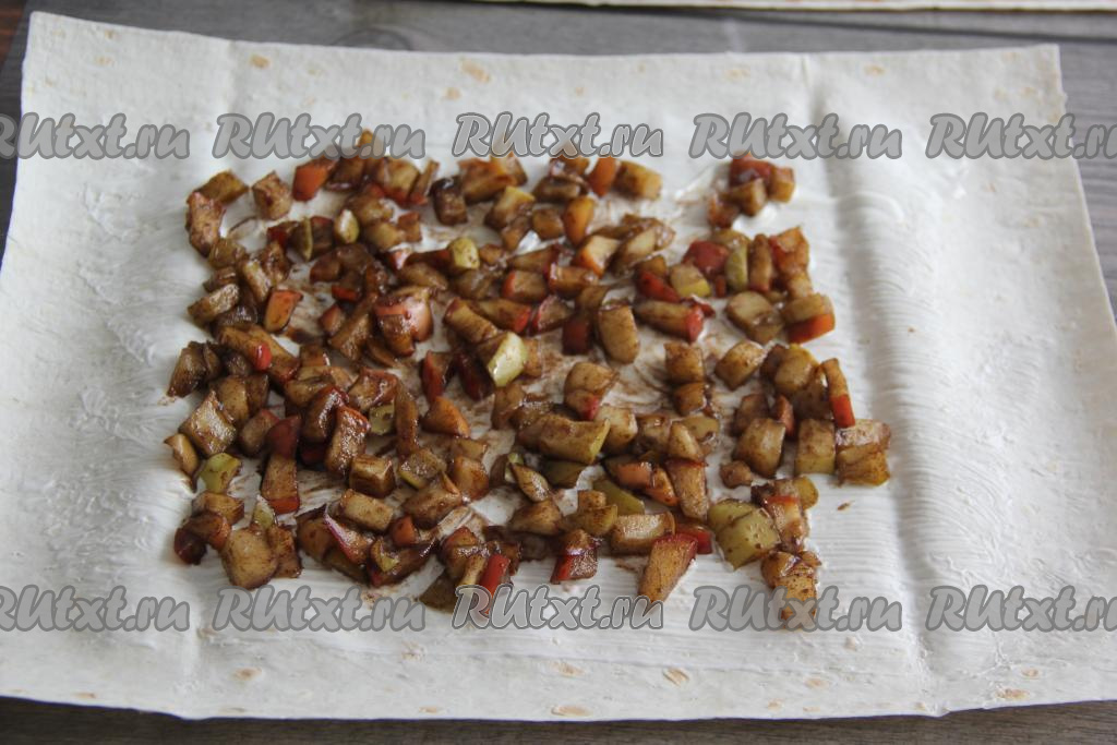 Разделить начинку на две части (мы будем готовить 2 штруделя). Выложить одну часть яблочной начинки на первый смазанный лаваш и разровнять по поверхности, оставляя края пустыми.