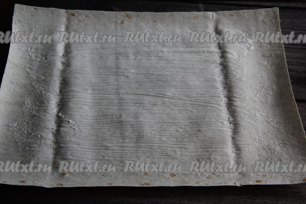 Каждый лист лаваша смазать сметаной, оставляя края чистыми.