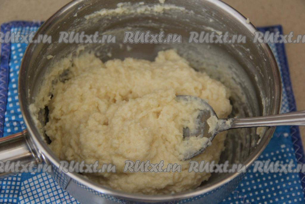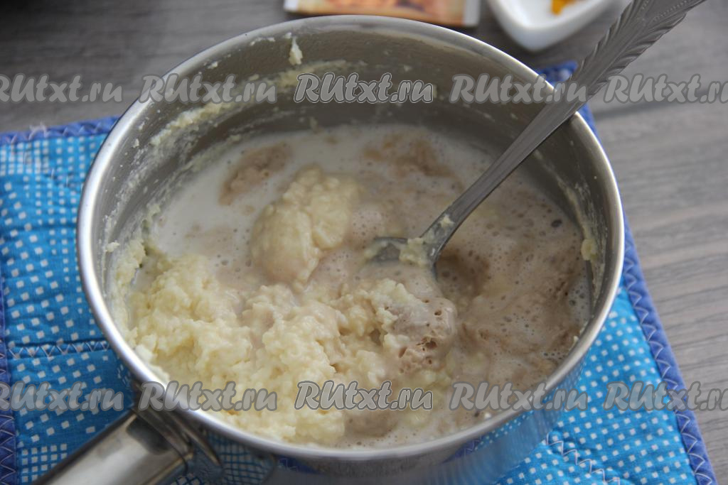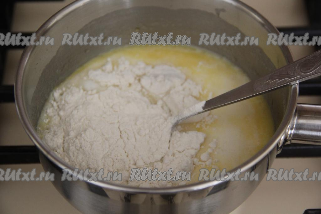 Снять с огня и сразу в смесь молока и масла всыпать 3 столовые ложки муки от общей массы. Перемешать быстро и тщательно массу ложкой, заваривая муку.