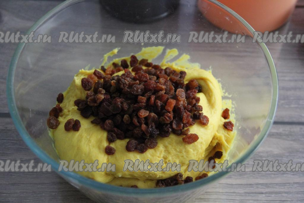 Заранее подготовить изюм, залить его кипятком, оставить минут на 5, а затем обсушить, выложив его на бумажное полотенце. Обмять тесто, добавить подготовленный изюм и вмешать его в тесто.