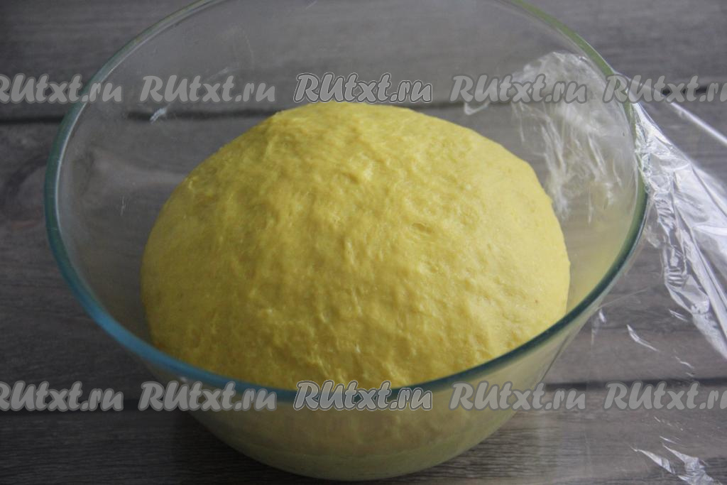 Тесто оставить на 1,5 часа в тепле (тесто должно увеличиться в объёме в 2-3 раза). Обмять его и дать подняться второй раз. Второй раз оно поднимется за минут 40.