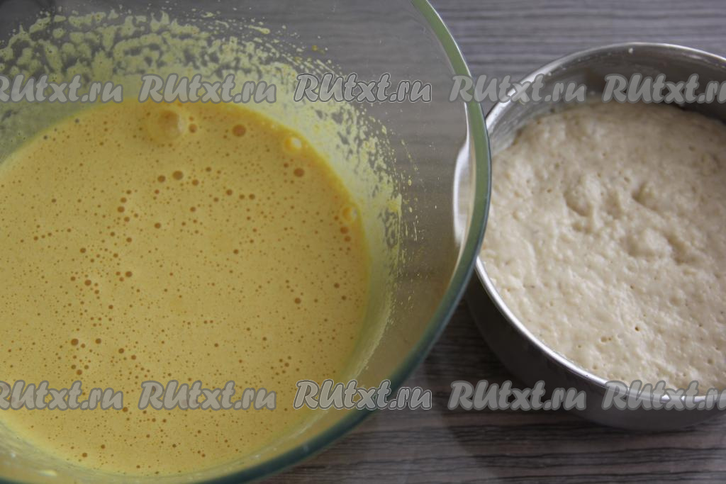 Смесь опары и заварного теста по прошествии 30 минут поднимется, примерно, вдвое, выложить её в миску с яичной массой.