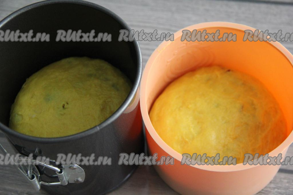 Разложить тесто по формам, заполняя на половину. У меня две формы больше среднего размера. Оставить формы с тестом в тепле на минут 35.