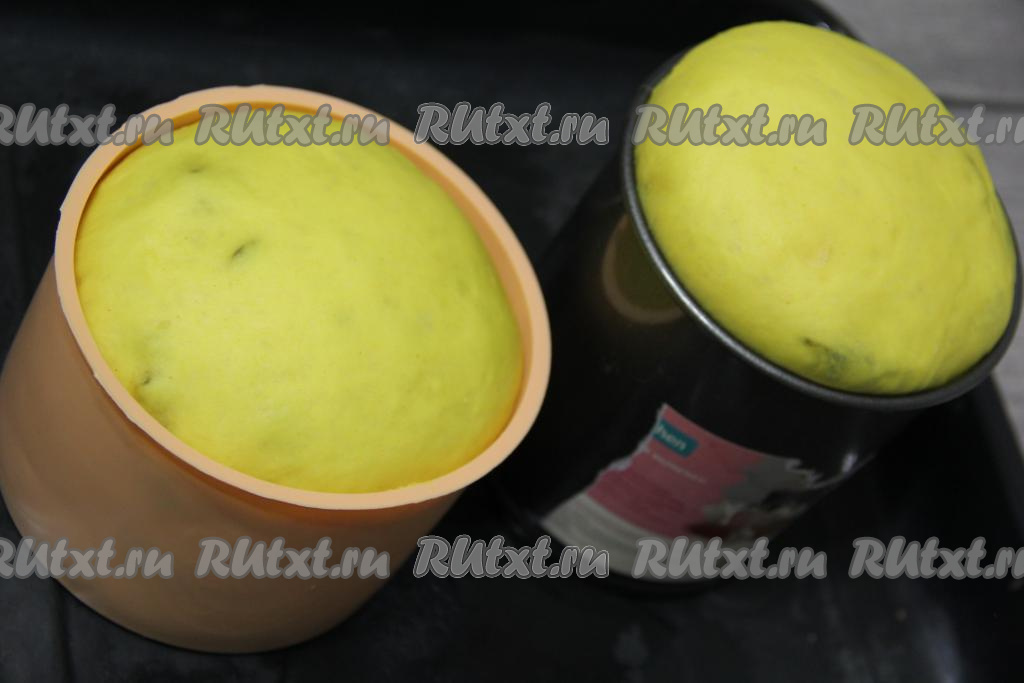 По прошествии времени тесто поднимется. Я немного передержала тесто в формах, оно поднялось даже чуть больше чем надо. Поставить формы с куличами в разогретую духовку и выпекать при температуре 180-200 градусов, примерно, 35 минут.