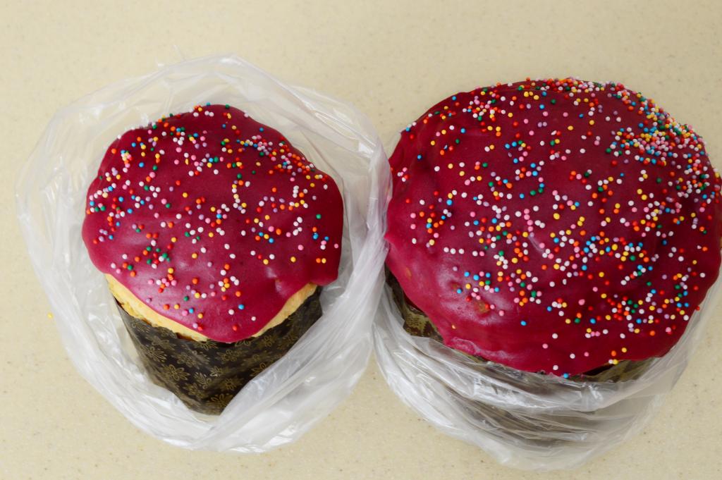 Остывшие наивкуснейшие куличи, приготовленные из заварного теста, украсить глазурью и посыпать кулинарной посыпкой.