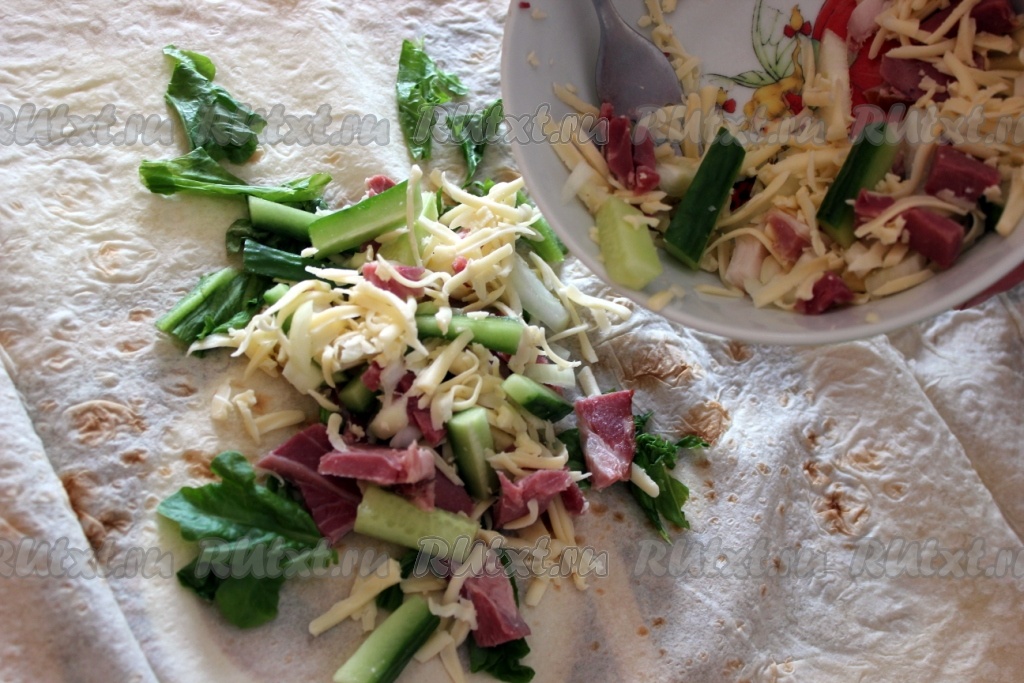 На лаваш выложить листовой салат и начинку.