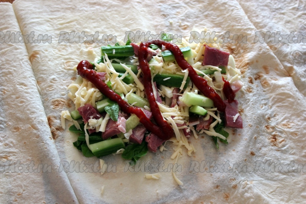 Добавить кетчуп по вкусу и свернуть шаурму конвертом.