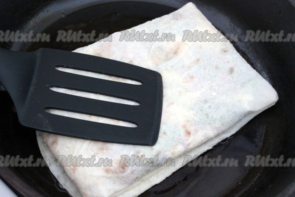 Затем шаурму в лаваше обжарить с двух сторон на раскаленной сковороде с небольшим количеством растительного масла, чтобы сыр внутри расплавился.