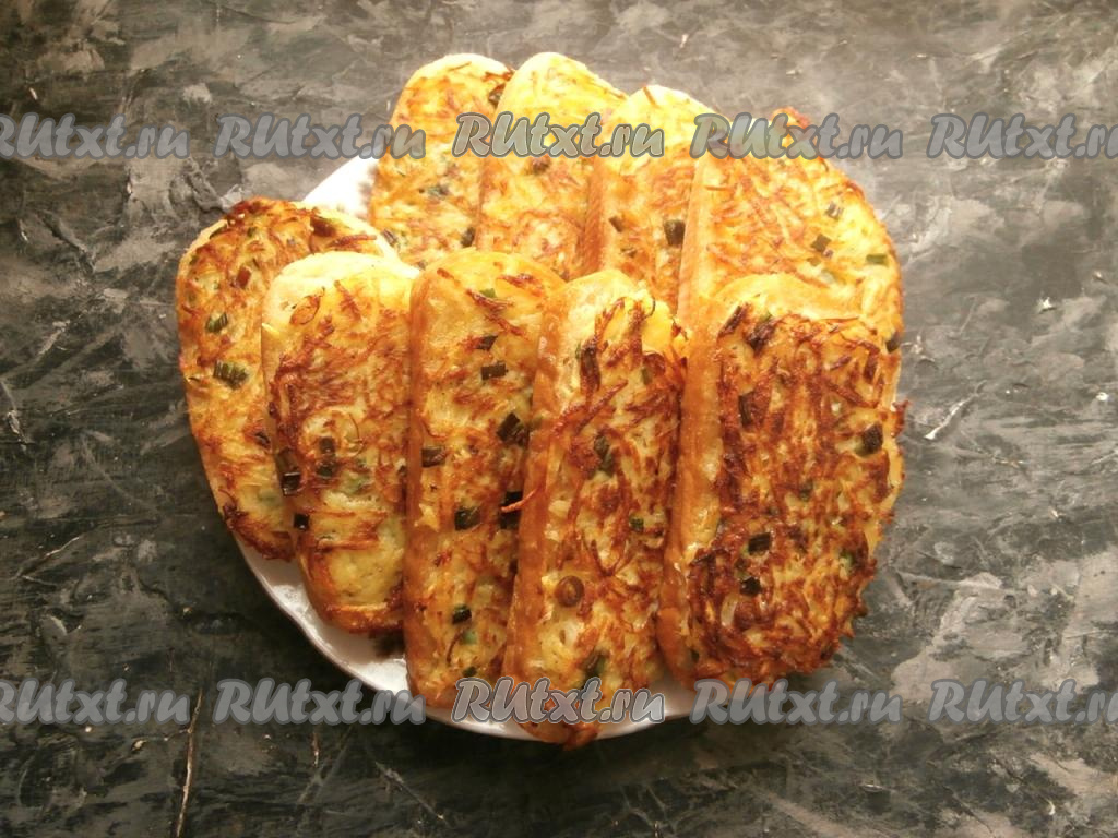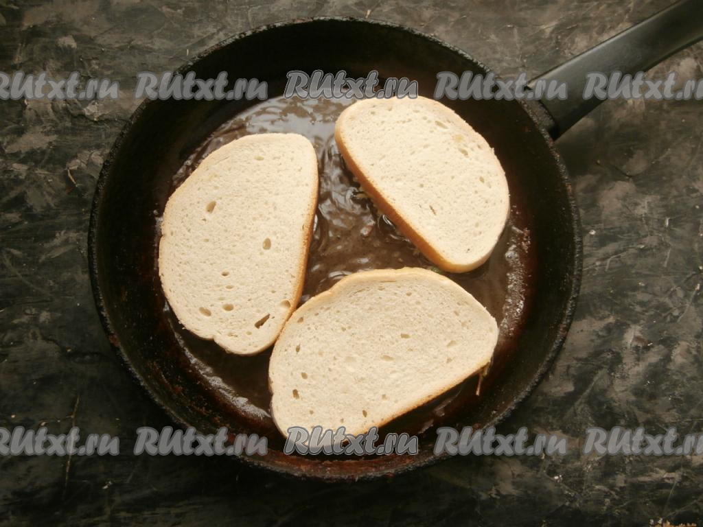 Масло разогреть в сковороде. Выкладывать ломти батона в сковороду картофельной стороной вниз. Жарить только с одной стороны на среднем огне до румяности картофеля (примерно, 3-4 минуты).