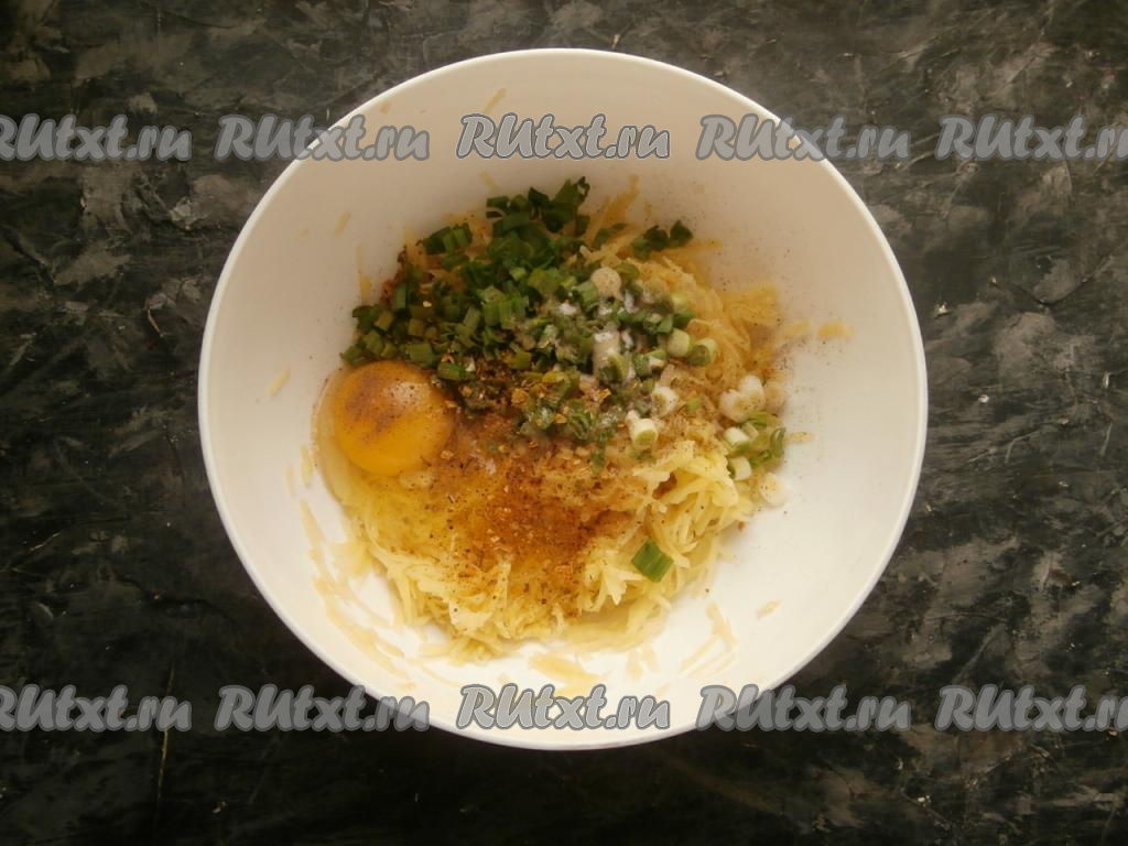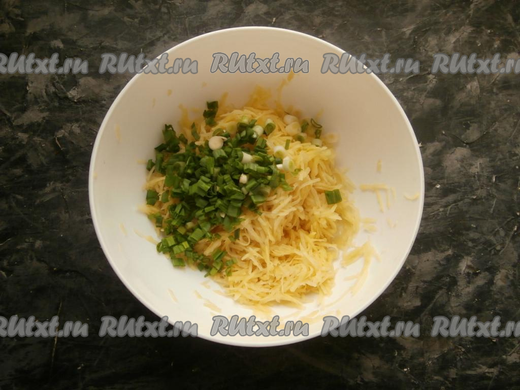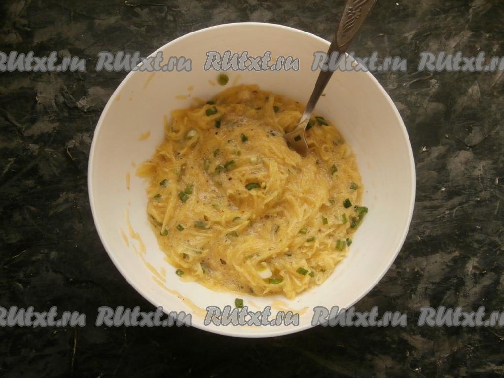 Очищенные картофелины натереть на средней тёрке, немного отжать от выделившегося сока. К натёртой картошке, отжатой от сока, добавить измельчённый зелёный лук.