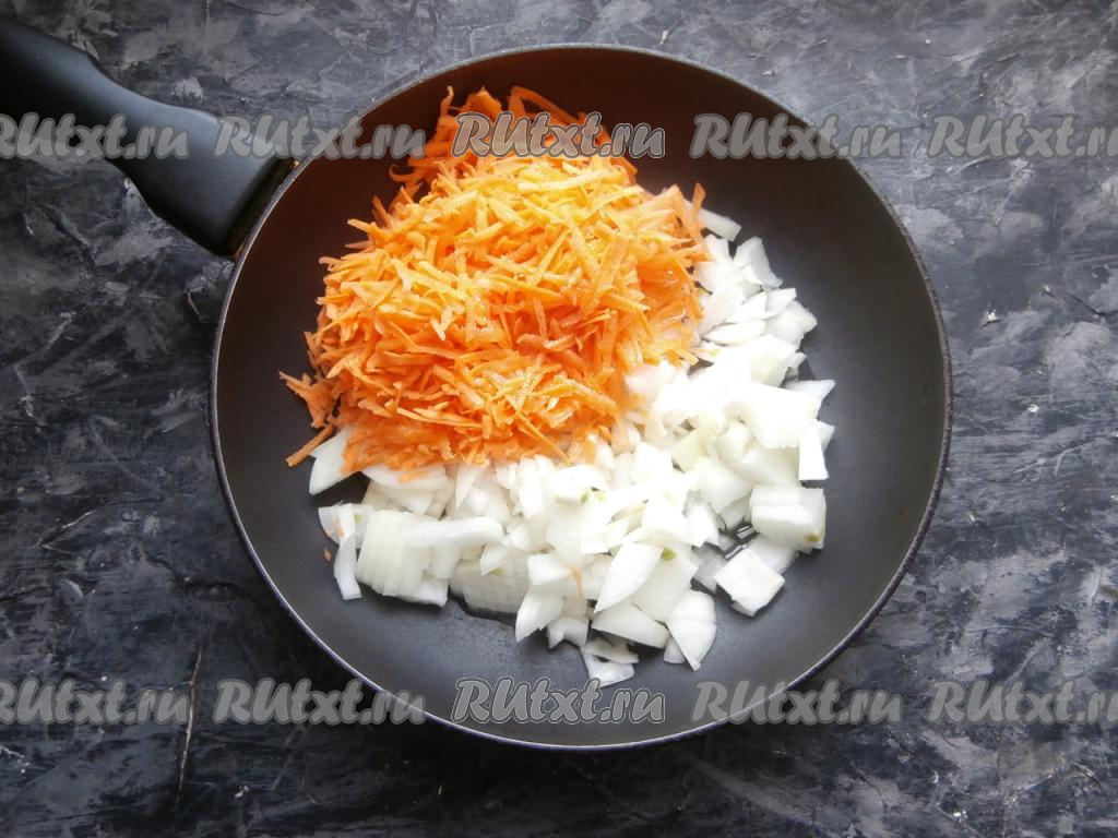 Морковку с луком очистила. Лук я нарезала небольшими кусочками, морковку натёрла на крупной тёрке и поместила овощи в сковороду с растительным маслом.