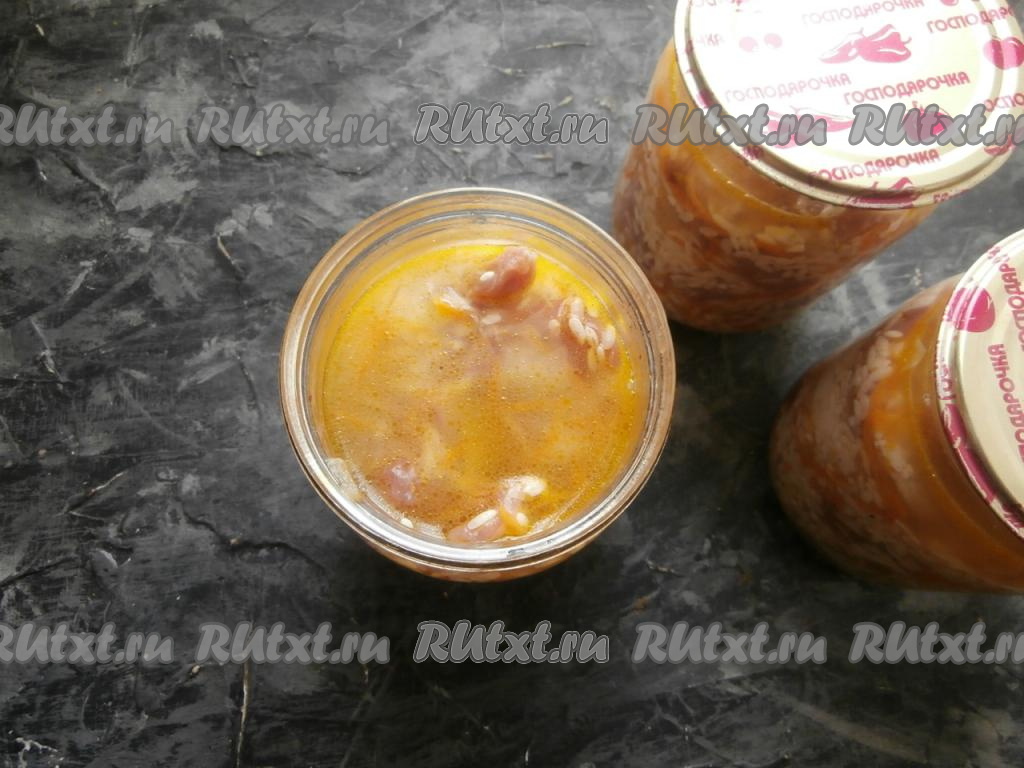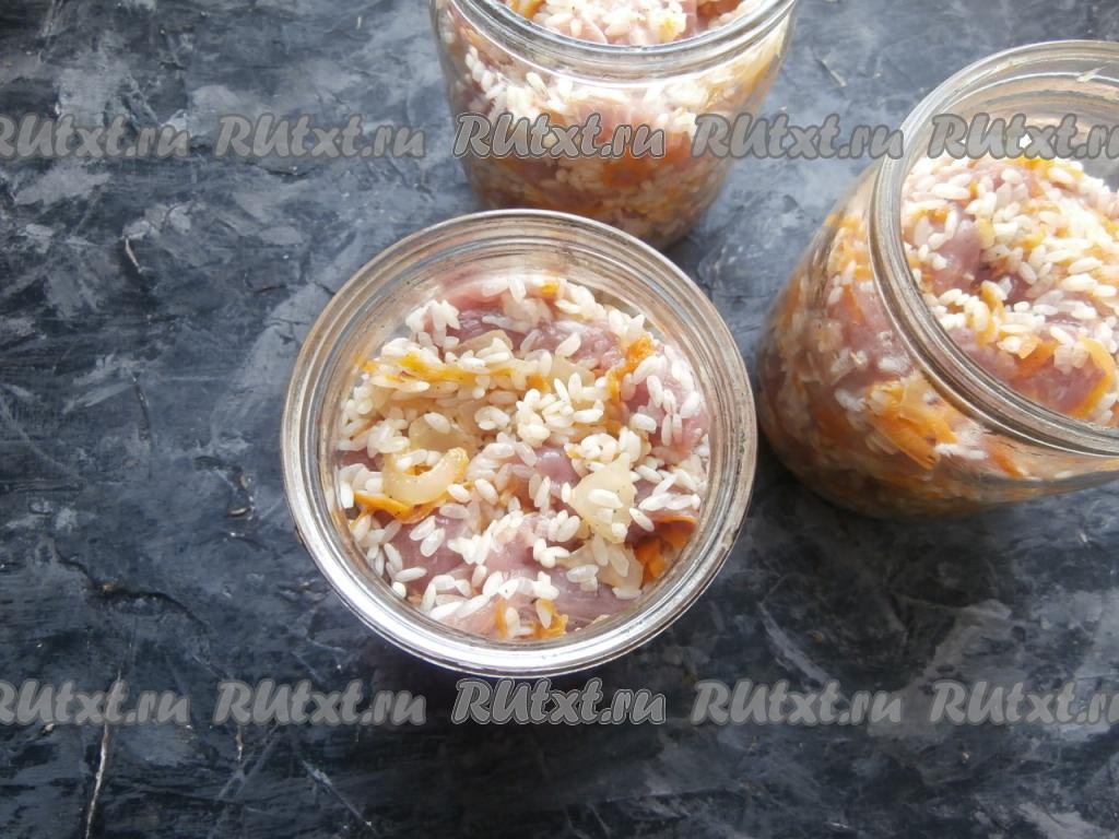 Банки и крышки я простерилизовала, разложила по банкам мясо с крупами так, чтобы баночки были наполнены начинкой на 2-3 пальца выше от середины.