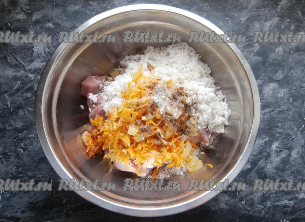 Добавила половину обжаренных овощей к мясу с рисом, всыпала половину соли, добавила 1 чайную ложку уксуса, поперчила.
