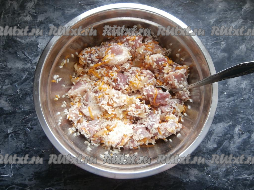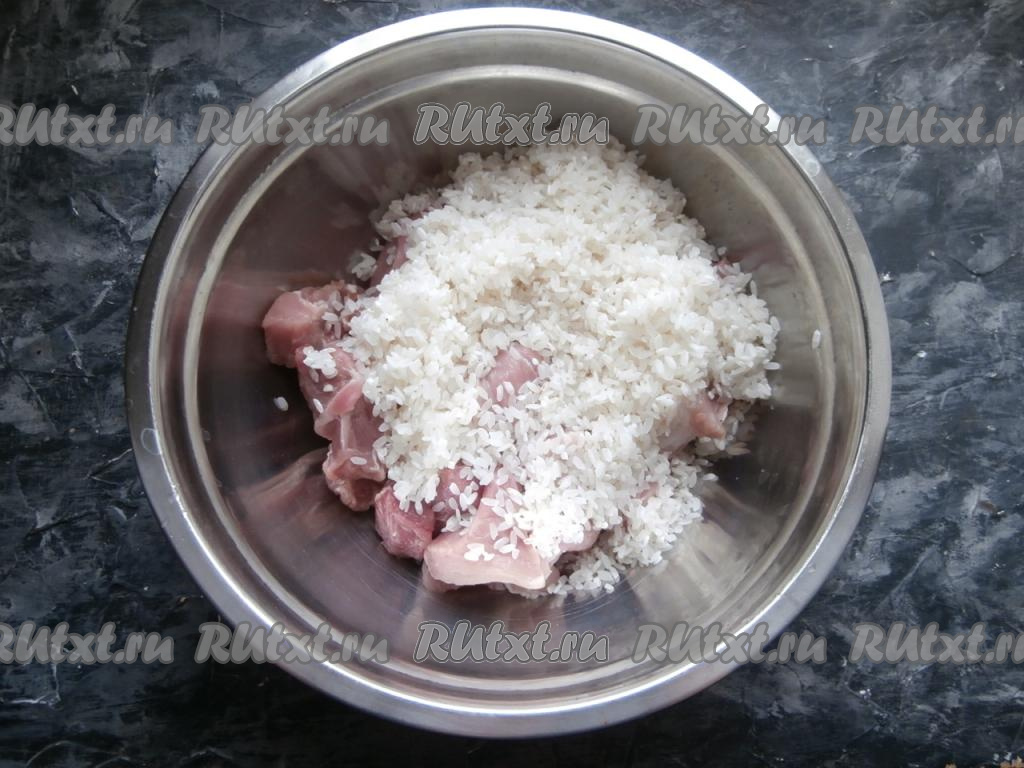 Далее нарезанное мясо я разделила на 2 части. К одной половине мяса я добавила рис.