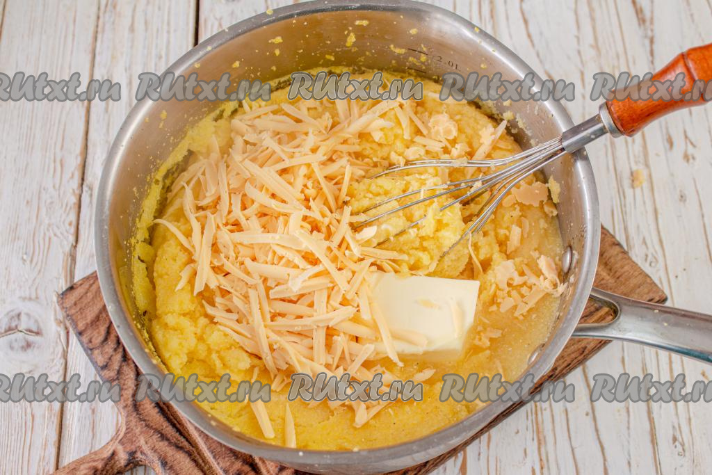 Сыр натрите на тёрке и с кусочком сливочного масла добавьте к мамалыге, хорошо перемешайте, проварите вместе на небольшом огне ещё 1-2 минуты и снимите с плиты.