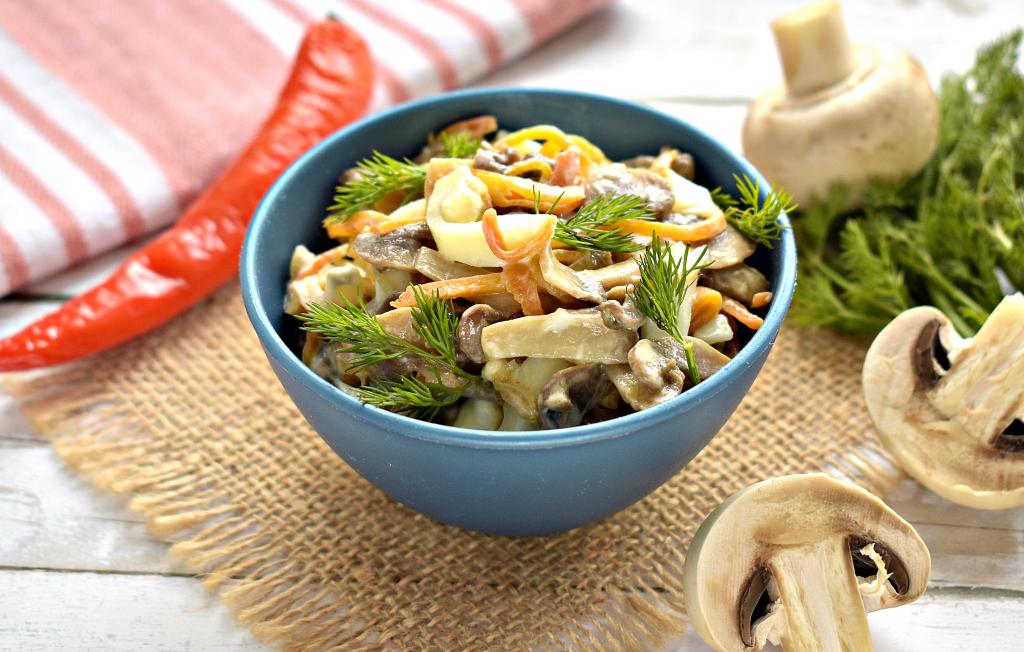 Вкусный, аппетитный, сытный салат, приготовленный из жареных шампиньонов с морковкой, яйцами и луком, перекладываем в салатник и можно подавать к столу.