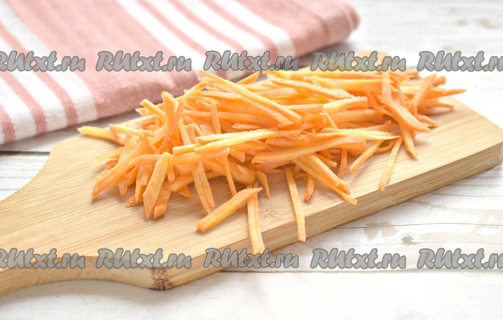 Очищаем морковь и луковицу. Нарезаем морковку тонкой соломкой (или натираем на тёрке для корейской моркови).