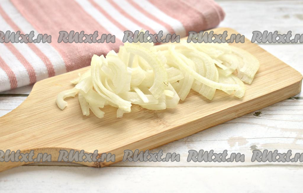 Луковицу вначале разрезаем пополам, а затем каждую половинку нарезаем на достаточно тонкие полукольца.