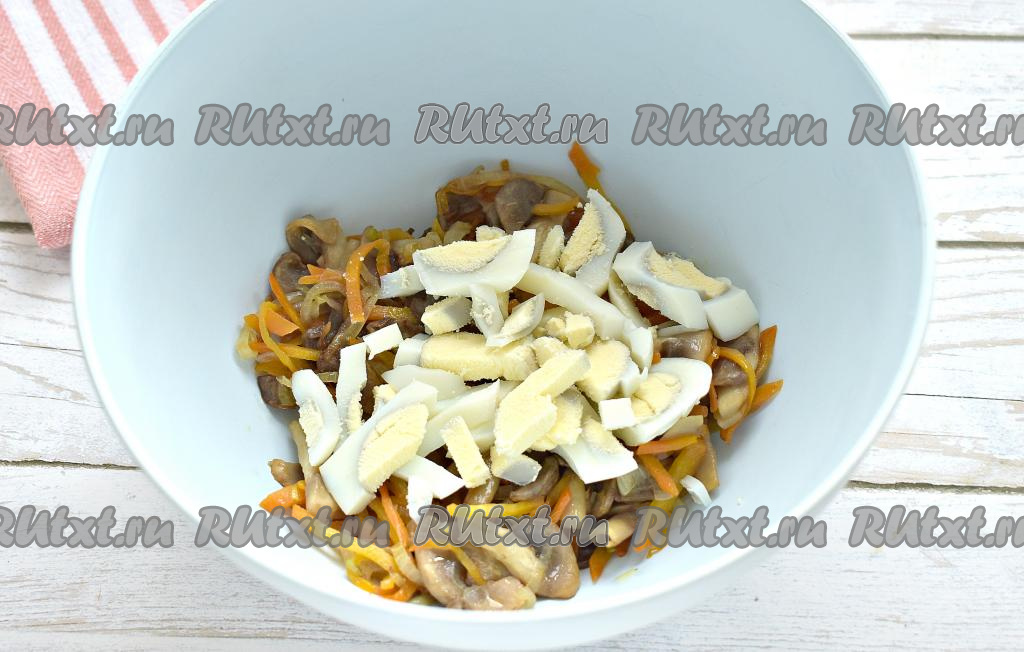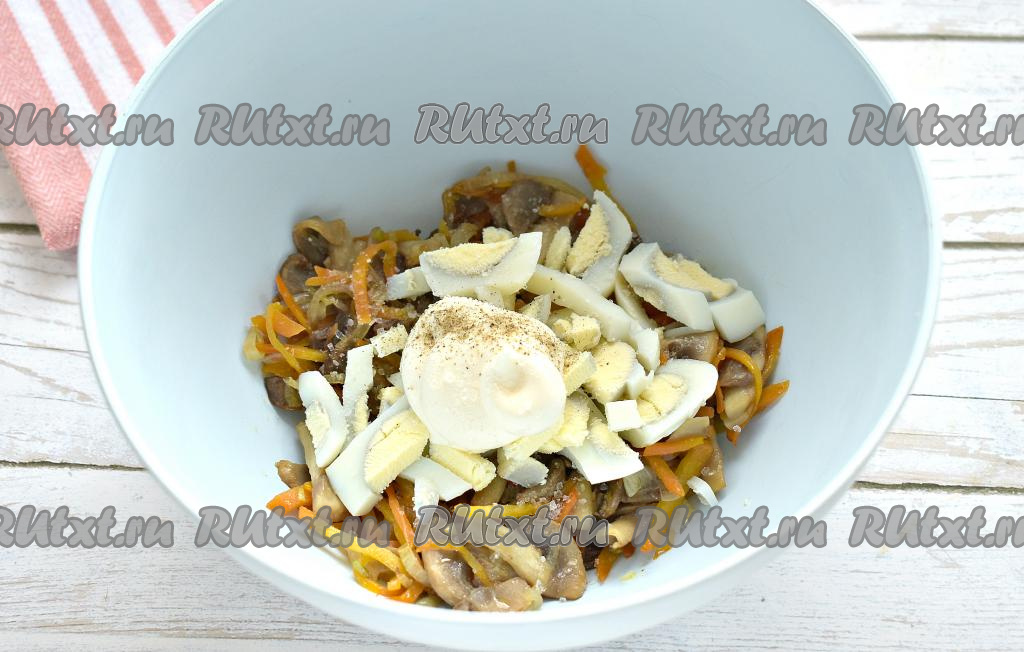 Перекладываем остывшие шампиньоны с морковью и луком в достаточно объёмную миску, добавляем нарезанные яйца.