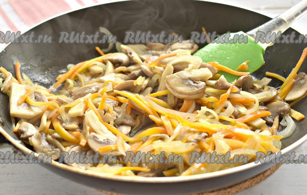 На сковороде прогреваем растительное масло, затем выкладываем морковь, шампиньоны и лук, перемешиваем. Обжариваем грибы с овощами, периодически помешивая, минут 10-12 на среднем огне, затем убираем с огня и остужаем.