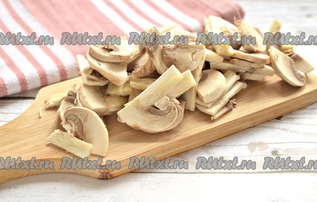 Свежие шампиньоны ополаскиваем холодной водой, удаляя загрязнения, обсушиваем и нарезаем грибы на тонкие пластины.