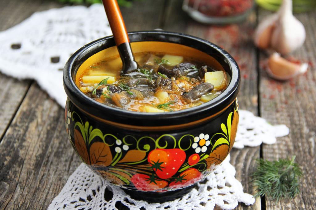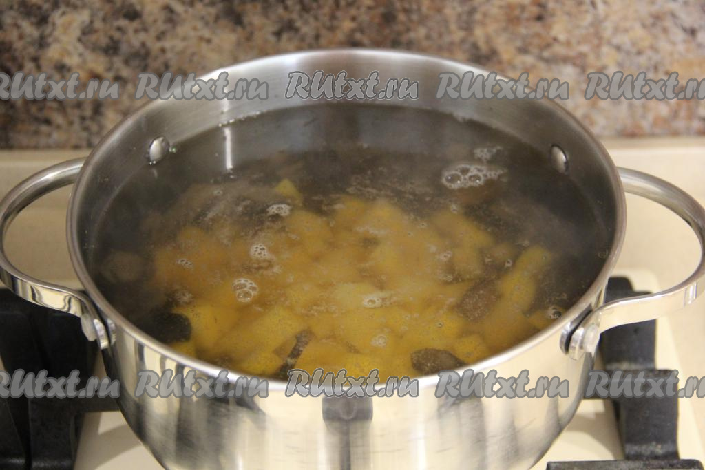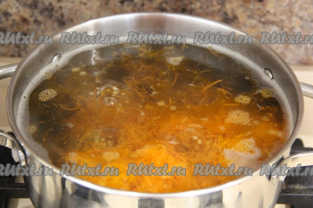 Когда картошка проварится минут 10, добавить в грибовницу обжаренную морковь, посолить по вкусу, снова дать закипеть, а затем проварить минут 10 (до мягкости картошки и пшена).