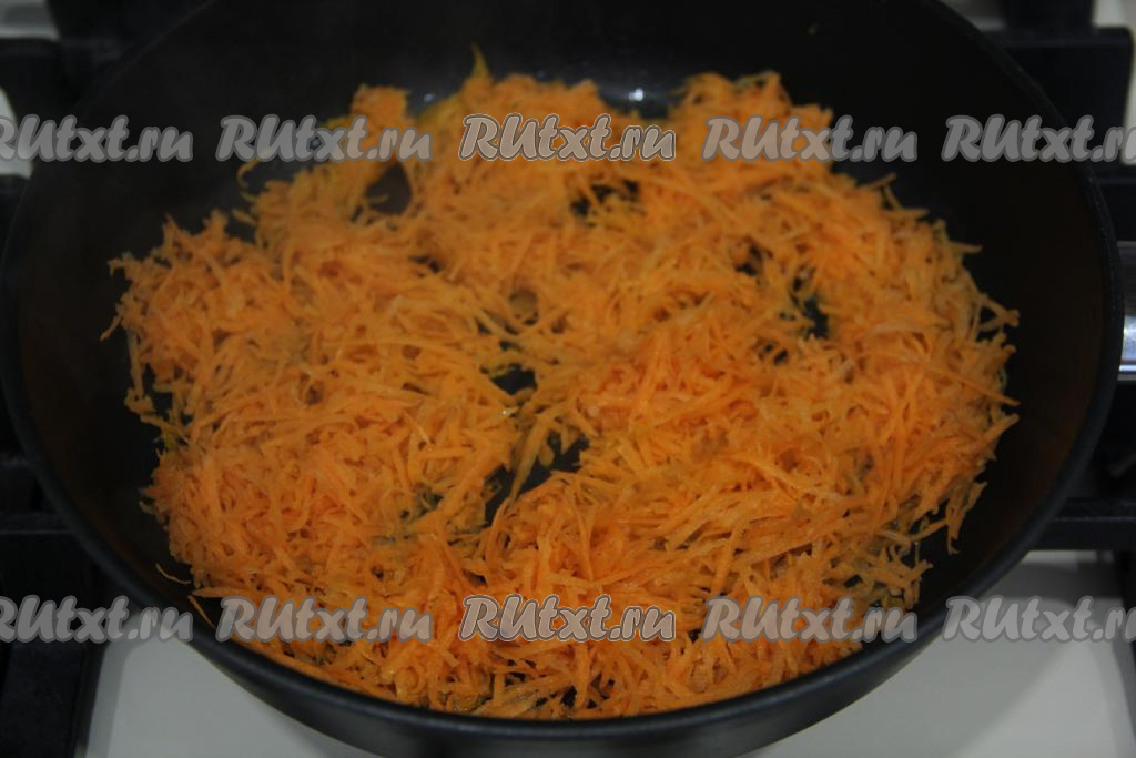 Морковь натереть на мелкой тёрке и обжарить на растительном масле на среднем огне, помешивая, до золотистого цвета.