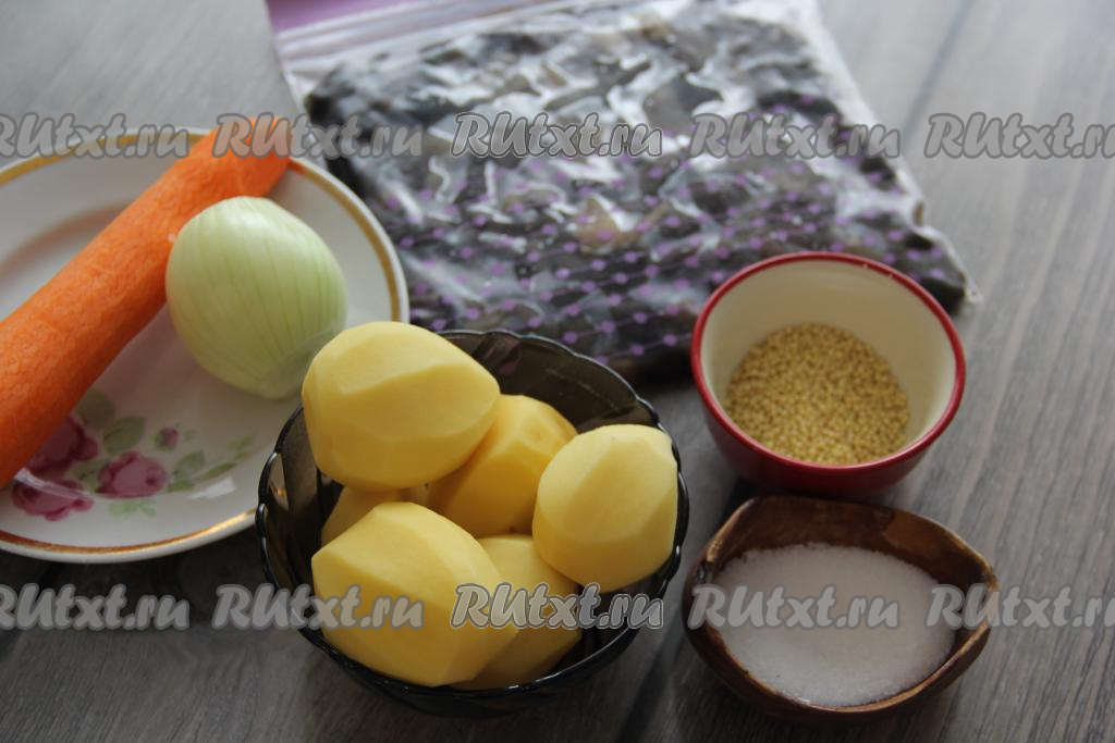 Подготовить продукты. У меня картошка мелкая, я почистила 6 штучек и положила в холодную воду, чтобы клубни не потемнели. Морковь и луковицу почистить. Замороженные лесные грибы предварительно разморозить при комнатной температуре.