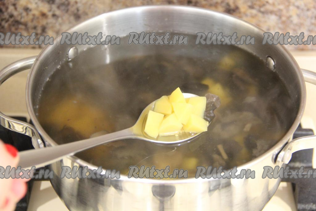 А после закипания, уменьшив огонь, варить грибы 30 минут. Затем вынуть луковицу, она нам больше не понадобится. Картошку нарезать на средние кубики и добавить в кастрюлю с отваренными грибами.