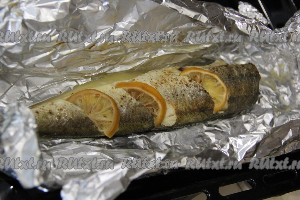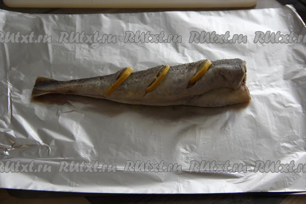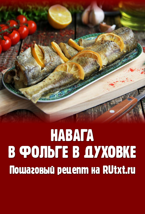 Переложить навагу, завёрнутую в фольгу, на противень и запекать в разогретой духовке минут 25 при температуре 180 градусов. Достать запечённую навагу из духовки, развернуть фольгу.