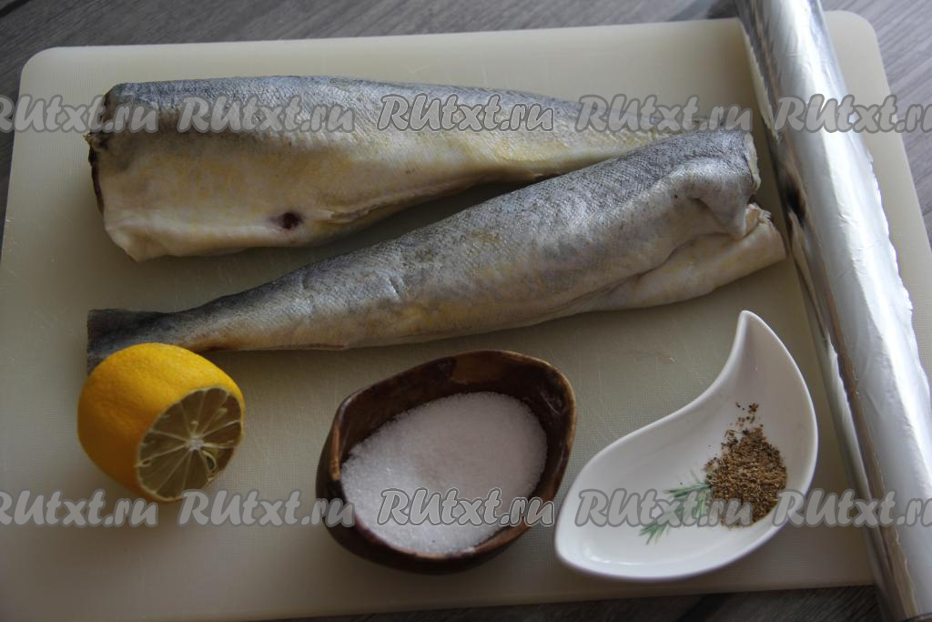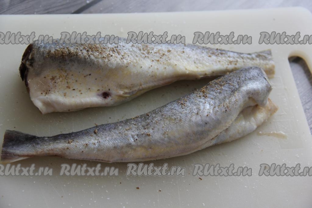 Подготовить продукты. Навагу разморозить, счистить (если есть) чешую, отрезать голову, плавники и хвост. Затем выпотрошить, не забывая удалить из брюшка чёрную плёночку, хорошо промыть под водой и обсушить рыбку. У меня навага была уже потрошёная без головы.