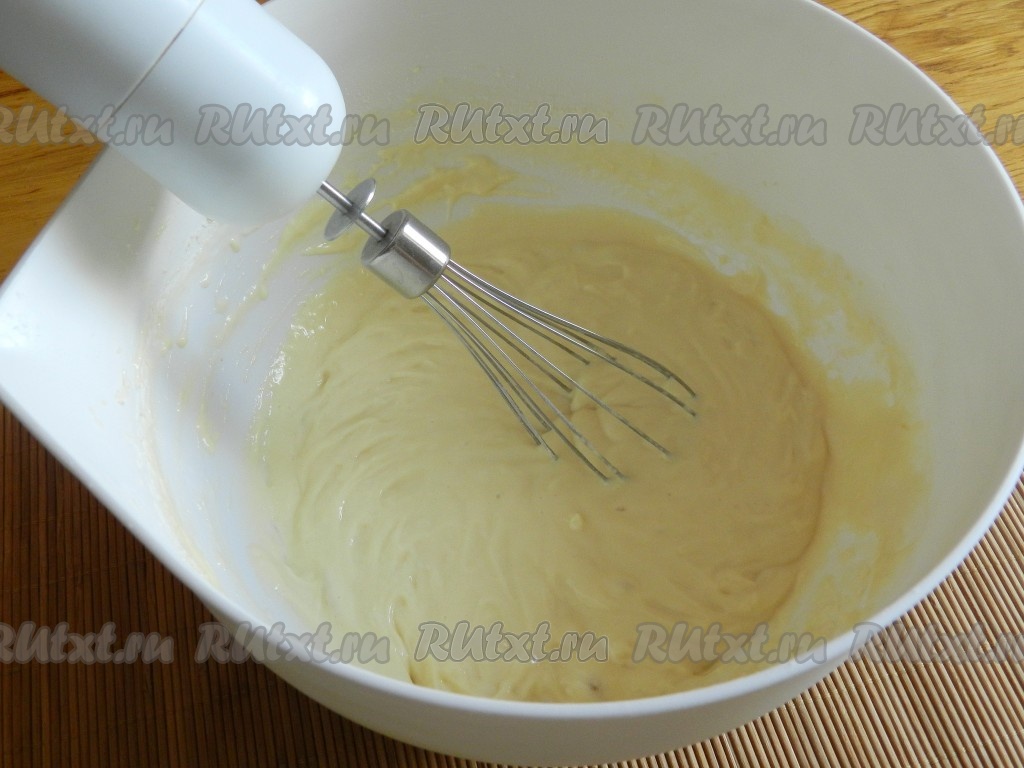 Для теста яйца взбить с солью, влить йогурт, перемешать. Муку смешать с разрыхлителем, постепенно всыпать в тесто.